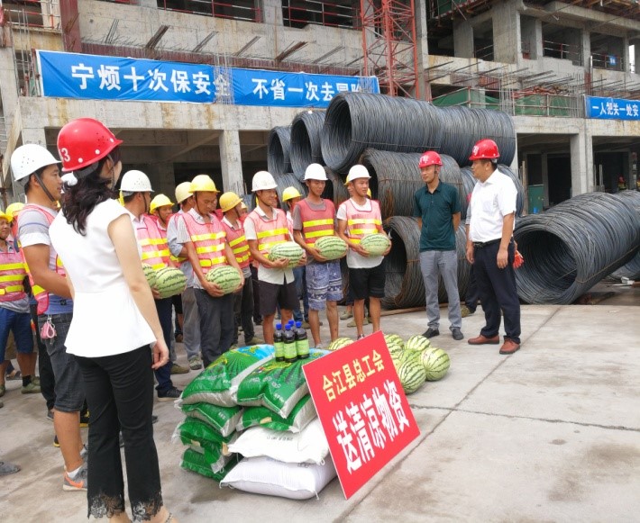 2019年8月5日下午,縣總工會(huì )會(huì )同城投公司、鑫晟公司、廣源達公司到鑫晟學(xué)府項目開(kāi)展送“清涼”活動(dòng)??h工會(huì )領(lǐng)導一行對建筑工人表示慰問(wèn),并為他們送上藿香正氣液、風(fēng)油精、西瓜、綠豆、白糖等降暑防暑物品。