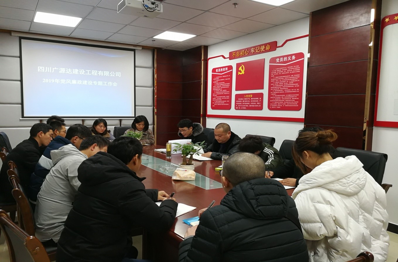 1月11日下午,四川廣源達建設工程有限公司組織召開(kāi)了2019年第一季度安全生產(chǎn)工作暨黨風(fēng)廉政建設工作會(huì )議。會(huì )上,董事長(cháng)譙棣升領(lǐng)學(xué)了安全生產(chǎn)工作相關(guān)文件,全面總結了2018年安全生產(chǎn)工作目標完成情況,并對2019年公司的安全生產(chǎn)工作提出了要求。同時(shí),董事長(cháng)譙棣升還著(zhù)重強調了廉潔從業(yè)相關(guān)事宜,要求抓黨風(fēng)廉政建設要像抓企業(yè)安全生產(chǎn)一樣持之以恒,與企業(yè)經(jīng)營(yíng)發(fā)展同頻共振;把廉潔從業(yè)作為企業(yè)發(fā)展的出發(fā)點(diǎn),堅持以廉潔凝聚人心,以廉潔樹(shù)立形象。